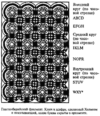 – Как всегда, – заметил Холмс, – чем больше добавляется, тембольше проясняется и становится понятнее. Первое слово самого текста – явнопредлог от, тем более что дальше в этой фразе содержится предлог к и упоминаниео второй могиле, которая, конечно, может быть, только сына Артура, потому чтоплитка с орнаментом находилась в нескольких шагах от могилы короля Артура.