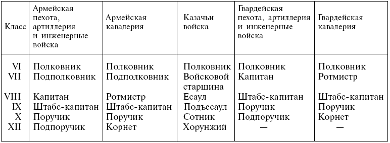 Военные чины Российской империи после реформы 1884 г. и их соответствие гражданским чинам (классам)