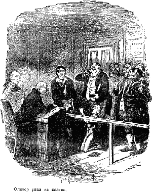 Это была просторная комната с большим окном. За конторкойсидели два старых джентльмена с напудренными волосами; один читал газету,другой, вооружившись очками в черепаховой оправе, изучал лежавший перед нимкусок пергамента. Мистер Лимкинс стоял перед конторкой с одной стороны, амистер Гэмфилд — его лицо было кое-как умыто — с другой; два-три грубоватых навид человека в высоких сапогах слонялись вокруг.