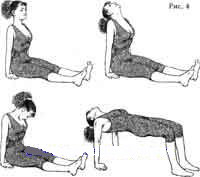 С помощью глубины прогиба вы сами регулируете интенсивностьзанятия. При повышенном давлении не рекомендуется прогибаться слишком глубоко,надо следить, чтобы голова оставалась выше уровня сердца. Однако довольно скоровы убедитесь, что оно просто в исполнении и прекрасно дополняет два предыдущих.Особенно полезно оно для женщин, находящихся в менопаузе.
