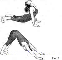 Затем сделайте медленный вдох и запрокиньте голову как можнодальше. На вдохе поднимите ягодицы вверх. При этом ваше тело образует вместе сполом правильный треугольник. Голову наклоните вперед и прижмите подбородок кгрудине, вы увидите ваши ступни. Тело должно иметь опору только на пальцы ног иладони. Если это трудно, опирайтесь на часть стопы. Не меняя точки опоры,вернитесь в положение лежа на выдохе, затем повторите движение несколько раз.Руки и ноги при этом остаются вытянутыми (Рис.5).