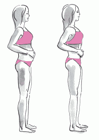 3. Затем поменяйте позицию: правая стопа плавно перекатывается с пятки на носок, коленка сгибается, а левая одновременно перекатывается с носка на пятку, чуть прогибаясь назад, коленка при этом как бы втягивается. Одновременно сделайте вдох, повторяя движения живота, как в первом упражнении.
