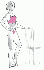 Исходное положение. Поставьте рядом с собой стул. Встаньте прямо, одна рука на поясе, другая опирается на спинку стула.