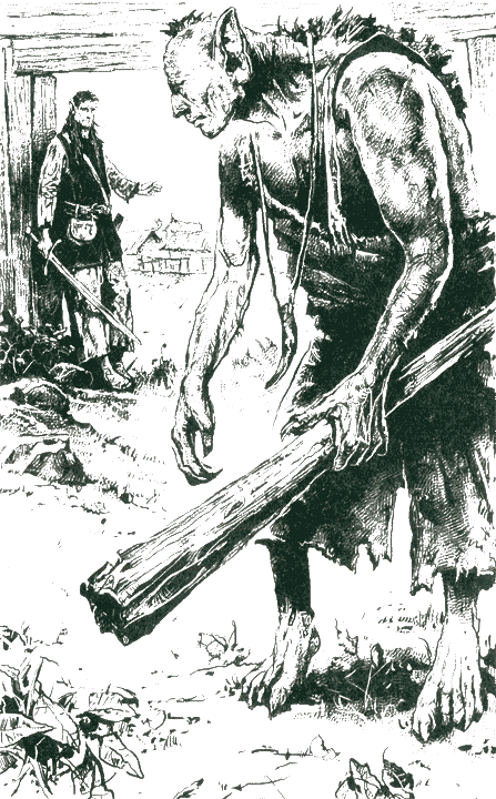 Из кустов выбирается здоровенный тролль. Основной недостаток троллей — медлительность, он только сейчас дотопал до поля боя. В руках гигант сжимает обломок скалы размером с хорошего барана.