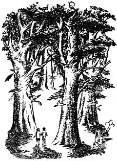 Юстэс по-прежнему держал ее за руку. Джил видела деревья, похожие на кедры, но выше. Росли они редко, кустов не было, и видно было далеко, налево и направо. Всюду было одно и то же — густая трава, радужно-пестрые птицы, голубые тени и больше ничего. Прохладный чистый воздух был совершенно тих, лес — пустынен.