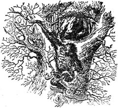Как только Хитр остался один, он поспешил своей неуклюжей походкой, то на двух, то на четырех, к дереву. Болтая сам с собой и гримасничая, он прыгал с ветки на ветку, пока не вошел в свой маленький домик. Ему нужны были иголка, нитки к большие ножницы, ведь он был очень умным Обезьяном, и гномы научили его шить. Он засунул клубок ниток в рот (это были очень толстые нитки, больше похожие на бечевку, чем на нитки), так что щека его раздулась, как будто он сосал большую конфету; зажал в губах иголку и взял ножницы в левую лапу. Затем он слез с дерева и вернулся к львиной шкуре, сел на корточки и принялся за работу.
