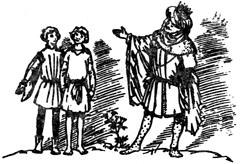 Вошли два воина с алебардами и стали справа и слева. Потом вошел герольд, потом трубач.