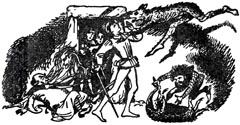 И тут все смешалось. Послышалось звериное рычание, звон стали. Мальчики и Трам устремились внутрь. Питер краем глаза заметил ужасное, серое, вытянутое в длину создание, наполовину человека, наполовину волка, набросившееся на мальчика примерно его возраста. Эдмунд увидел барсука и гнома, которые катались по полу, как дерущиеся кошки. Трам очутился лицом к лицу с ведьмой. Ее нос и подбородок торчали наподобие щипцов для орехов, грязные серые волосы развевались. Она схватила доктора Корнелиуса за горло. Трам взмахнул мечом и ее голова покатилась по полу. Тут светильник был сбит и несколько секунд работали мечи, зубы, когти, кулаки и башмаки. Затем наступило молчание.