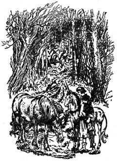 Двое тархистанцев правили лошадью, тянущей бревно. Как раз в тот момент, когда король добрался до них, бревно застряло в грязи.