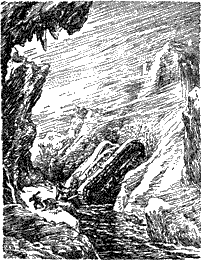 Еще через минуту совершенно неожиданно перед кабиной возникла из снежной мглы высокая ледяная стена из торосов, почти отвесно спускавшаяся к воде. Очевидно, льдина отделилась от ледяного поля непосредственно по линии торосистой гряды. Взобраться на нее прямо из воды было совершенно немыслимо.