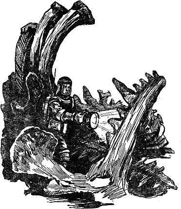 Я внимательно смотрел по сторонам. Камни отбрасывали от себя сплошные длинные тени. Вдруг в одном месте я видел странную решётчатую тень — как от полуразвалившейся корзины. Я указал не неё Соколовскому. Он тотчас же остановил ракету, и я побежал к тени. По виду это был камень, но камень необычайной формы: он напоминал часть позвоночного столба с рёбрами. Неужели мы нашли останки вымершего чудовища? Значит, на Луне существовали даже позвоночные животные? Следовательно, она не так уже скоро лишилась своей атмосферы. «Позвонки» и «рёбра» были слишком тонки для своих размеров. Но ведь на Луне тяжесть в шесть раз меньше, чем на Земле, и животные могли иметь здесь более тонкие скелеты. Притом это, наверное, было морское животное.