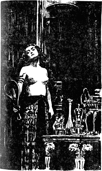 С одной стороны девушка была освещена красным огнем высокого бронзового светильника, с другой — голубым лучом луны, падавшим сквозь высокие колонны. Бронзовое зеркало несколько золотило ее смуглый цвет кожи, и вместе с двойным освещением ее лицо, отраженное в зеркале, приобрело необычайно сложную окраску.