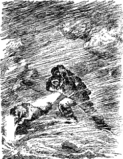 Из крутящейся молочной мглы неожиданно донесся крик, потом другой. Плутон громко залаял, бросился вперед и на минуту исчез. Опять послышались крики, они переплелись с приглушенным лаем собаки, лай усилился, и внезапно из снежной пелены громадным скачком вынырнул Плутон и следом за ним фигура облепленного снегом человека.