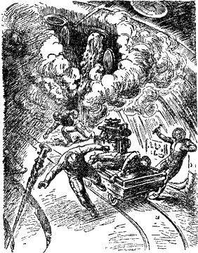 Пока они оттаскивали в сторону освобожденную из-под перевернувшегося электрокара девушку, Садухин вывел под приоткрытое отверстие новый электрокар с трубой и пустил в ход коническую вершину трубы. Вращаясь, она поднялась вверх, уперлась в заслонку и прижала ее к потолку.