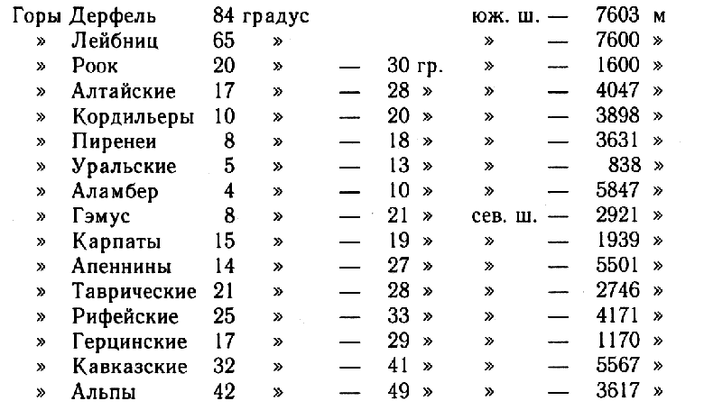 Приводим таблицу этих гор в порядке их расположения с юга на север, с указанием широт и долгот и высоты самых высоких пиков.
