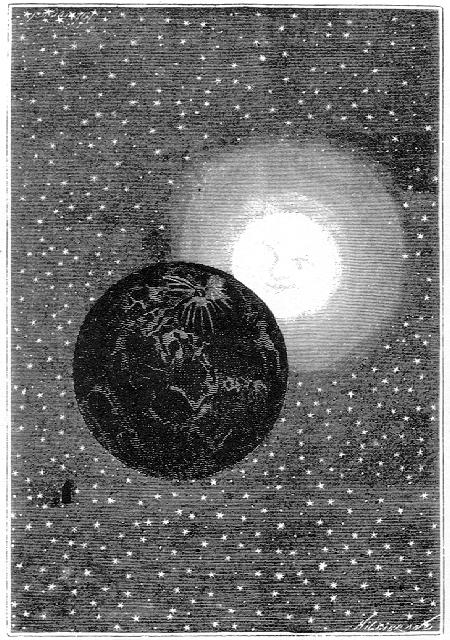 К четырем часам утра на пятидесятой параллели наших героев отделяли от Луны всего шестьсот километров. С левой стороны от них тянулась горная цепь самых причудливых очертаний, залитая ярким солнечным светом. С правой — напротив — зияла черная впадина, наподобие мрачного бездонного колодца, вырытого в почве Луны.