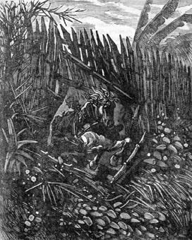 Конь очертя голову бросился в крааль. Частокол подался, как если бы в него попала бомба, и теперь бедное животное, вконец замученное колючками, неслось куда глаза глядят.