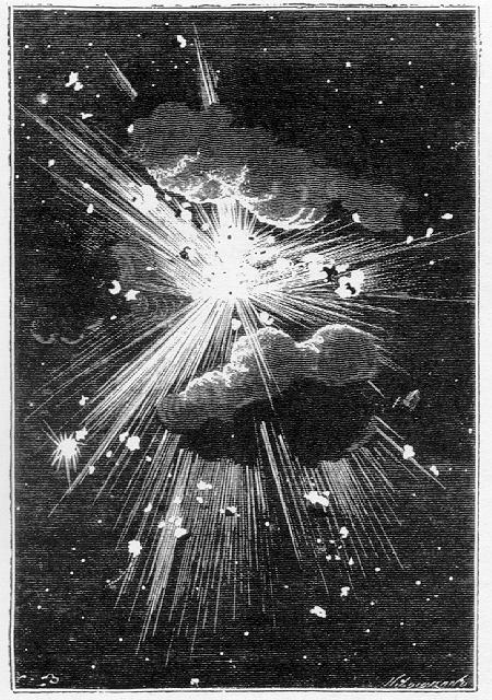 Две минуты, прошедшие с момента появления болида, показались им двумя веками смертельного ужаса! Снаряд должен был с минуты на минуту столкнуться с болидом. Вдруг огненный шар, как бомба, разорвался на их глазах, но при этом совершенно беззвучно. Никакого звука, возникающего в результате воздушных колебаний, в окружавшей их пустоте произойти не могло. На крик Николя друзья бросились к окнам. Какое зрелище! Чье перо, чья кисть смогли бы описать все богатство красок развернувшейся перед ними картины! Ее можно было сравнить с жерлом разверзшегося. кратера или с грандиозным пожаром. Тысячи светящихся осколков всех размеров, всех цветов, всех оттенков пересекали и освещали пространство. Перед глазами друзей словно развернулся гигантский многоцветный сверкающий веер всех цветов радуги — желтого, оранжевого, красного, зеленого, серого. От страшного колоссального шара остались только разлетевшиеся по всем направлениям осколки, в свою очередь превратившиеся в мелкие астероиды. Некоторые из них сверкали как сталь, другие были окружены беловатым облачком; за иными тянулся светящийся хвост космической пыли.