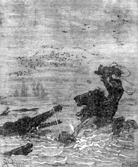Пузыри возникают на воде и лопаются, а в воздухе, громко крича, реют водяные птицы. Несколько странных черных точек едва показываются над водой и тотчас снова исчезают.