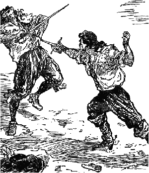 Он знаком остановил людей, которые пытались помешать столкновению,и со звоном скрестил свой клинок со шпагой Левасёра.