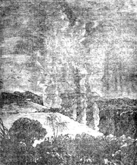 Распыленная вода поднимается высоким столбом и снова падает дождем мельчайших брызг на кусты, на дикие финики, на ползучие растения, на листву и оживляет их густой темно-зеленый цвет; она постоянно обмывает ветви и корни деревьев, струится по ним и снова падает в раскрытую бездну, но дна не достигает, ибо движение воздуха, вызываемое водопадом, создает новое течение, которое снова ее поднимает.