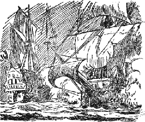 На палубу доносились со шкафута крики отчаяния, крепкаяиспанская ругань и стоны раненых. Покачиваясь на волнах, «Милагроса» медленнодвигалась вперёд; в её борту зияли огромные дыры, фок-мачта была разбита, а внатянутой над палубой сетке чернели обломки рей. Нос корабля был изуродован:одно из ядер разорвалось внутри огромной носовой каюты, превратив её в щепы.