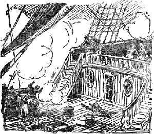 Корабль дона Мигеля вздрогнул от носа до кормы и от киля доверхушки грот-мачты. Оглушённая и потерявшая равновесие Арабелла Бишоп упалабы, если бы не его светлость, оказавший пассивную, но реальную помощь. ЛордДжулиан успел вцепиться в поручни, а девушка ухватилась за его плечи иблагодаря этому держалась на ногах. Палуба покрылась клубами едкого дыма, откоторого все на испанском корабле начали задыхаться и кашлять.