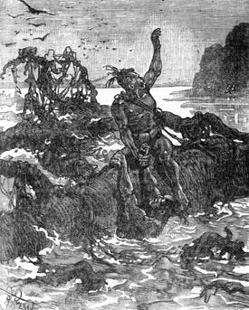 Смелый каталонец бросился в волны, и они разбились в сверкающую пыль. Затем он стал сильно грести руками и поплыл к тому месту, где выбивались из сил истощенные борьбой негры. А течение все ломало и ломало обломки их плота. Несмотря на прилив энергии, которую им теперь подавала надежда на спасение, они уже с трудом держались.