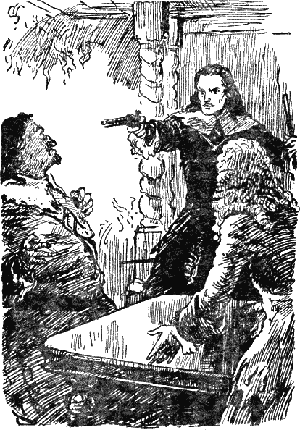 И тут же, издав горлом какой-то неопределённый звук, онзастыл на месте. Капитан Блад, вытащив из-за отворота камзола правую руку,держал в ней пистолет, богато украшенный золотом и серебром. Чёрное дулопистолета глядело прямо в лоб губернатору.