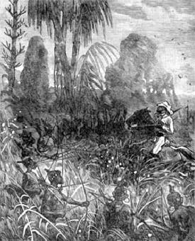 Он быстро вскинул свою двустволку и выстрелил из обоих стволов. Два человека сразу упали. Вопль бешенства сопровождал это падение. Черные ответили продолжительным победным воем и стали забрасывать нападавших копьями. Но тут вождь издал пронзительный свист, который для воинов был сигналом к отступлению. Отряд медленно и в полном порядке отступил в самую гущу зарослей.