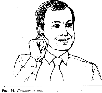 Фактически этот жест вызван желанием слушающего отгородитьсяот слов, положив руку около или сверху уха. Этот жест является взрослойусовершенствованной модификацией жеста маленького ребенка, когда он затыкаетуши, чтобы не выслушивать упреков родителей. Другими вариантами прикосновения куху является потирание ушной раковины, сверление в ухе (кончиком пальца),потягивание мочки уха или сгибание уха в попытке прикрыть им слуховоеотверстие. Этот последний жест говорит о том, что человек наслушался вдоволь ихочет, возможно, высказаться.