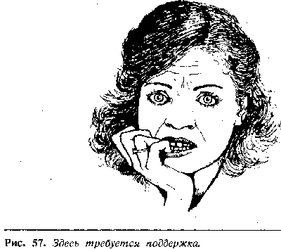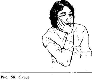 Степень наскучивания соотносится с выраженностьюиспользова-ния руки как опоры. Предельная скука и отсутствие интереса видны,когда голова полностью лежит на руке (рис. 58), и абсолютным сигналом скукибудет, если человек лежит головой на столе и похрапывает!
