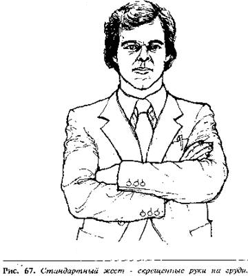 Когда при беседе с глазу на глаз вы видите, что вашсобеседник скрещивает руки на груди, следует сделать вывод, что вы сказаличто-то, с чем ваш собеседник не согласен. Несмотря на то, что на словах онбудет выражать согласие с вами. Дело в том, что невербальные средства общенияне могут лгать, в то время как вербальные могут. В этот момент вы должныпостараться выяснить причину его жеста и побудить человека занять болеерасполагающую позу. Помните: до тех пор, пока человек будет держать руки скрещеннымина груди, он будет сохранять отрицательное расположение. Напряженное внутреннеесостояние заставляет чело-века принять этот жест, а сохранение жестаподдерживает внутреннее напряжение.
