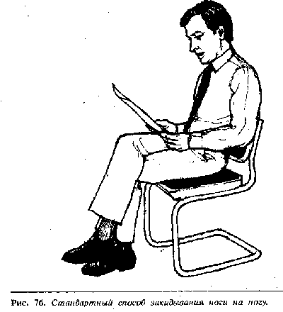 Одна нога аккуратно лежит на другой, обычно правая на левой— это нормальное положение скрещенных ног, используемое европейцами, и можетиспользоваться для выражения взволнованного состояния, сдержанной или защитнойпозиции. Это, однако, — один из вспомогательных жестов, которыйсопровождается другими нега-тивными жестами, и не должен интерпретироваться вотрыве от контекста. Например, люди часто сидят закинув нога на ногу во времялекций или во время долгого сидения на неудобных стульях.