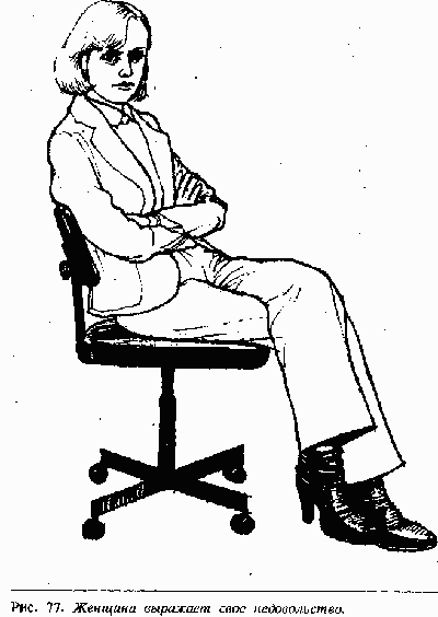 Часто люди используют этот жест в холодную погоду. Когдазакинутая нога на ногу сопровождается еще и скрещиванием рук на груди (рис.77), это означает, что человек «отключился» от разговора. Коммивояжеру глупобыло бы даже пытаться спрашивать покупателя, принявшего такую позу, о егорешении, и следует задать несколько уточняющих вопросов, чтобы выяснить еговозражения. Эта поза очень популярна у женщин во всем мире, особенно если онихотят выразить свое недовольство мужем или другом.