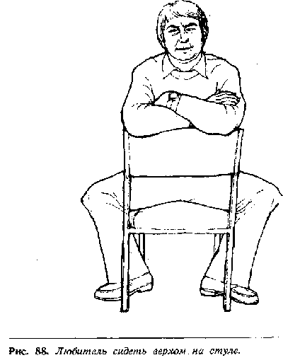 Много веков назад мужчины пользовались щитами, чтобызащититься от копий и дубинок врагов, а сегодня цивилизованный мужчинаиспользует все, что попадется под руку для такого символического щита, которымон защищается от физического или словесного нападения. Это может быть укрытиеза забором, дверью, столом, открытой дверцей машины или спинкой стула во времясидения на нем верхом (рис. 88). Спинка стула служит защитным средством и можетпревратить его в агрессивного, атакующего воина.
