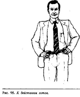 Чтобы сделать правильные выводы относительно намеренийчеловека, поставившего руки на пояс, необходимо рассматривать обстоятельства,при которых это происходит, и понаблюдать за предшествующими жестами. Рядпоследующих жестов может укрепить вас в своем мнении. Например, расстегнут липиджак и откинуты ли полы пиджака на спину, или он застегнут в тот момент,когда человек ставит руки на пояс? Агрессивная поза при застегнутом пиджакепоказывает сильное расстройство, в то время как расстегнутый пиджак и откинутыефалды (рис. 95) есть чисто агрессивная поза, потому что человек открываетобласть сердца и горла, выказывая невербально бесстрашие. Это поза может бытьболее усилена, если человек расставляет широко ноги или сжимает пальцы вкулаки.