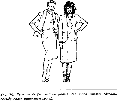 Жесты агрессивной готовности используются профессиональнымиманекенщицами, чтобы передать, что их одежда предназначена для современной,агрессивной, предприимчивой женщины. Иногда этот жест проделывают только однойрукой на бедре, другая рука принимает иное положение (рис. 96). При этом жестечасто наблю-даются жесты критической оценки.