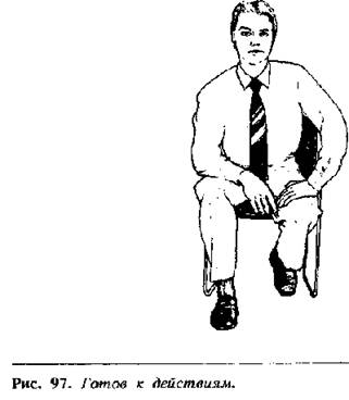 Жесты готовности, сигнализирующие о желании закончитьразговор или встречу, выражаются подачей корпуса вперед, при этом обе рукилежат на коленях (рис. 98), или обе руки держатся за боковые края стула (рис.99). Если любой из этих жестов появляется во время разговора, было бы разумно свашей стороны взять инициативу в свои руки и первым предложить закончитьбеседу. Это позволит вам сохранить психологическое преимущество иконтролировать ситуацию.