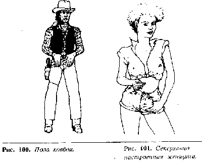 Сексуальная агрессивная поза выражается следующим жестом —большие пальцы рук затыкаются за пояс или за прорези карманов. Это один изнаиболее популярных жестов, используемых актерами телевизионных вестернов,чтобы показать мужественность любимых героев-гангстеров (рис. 100). Рукинаходятся в положении готовности и служат центром притяжения внимания,акцентируя область гениталий. Мужчины используют этот жест, чтобы отметить своютерриторию или показать другим мужчинам, что они их не боятся. Когда жест используетсяв присутствии женщин, он может истолко-вываться так: «Я мужчина. Я над тобойвластвую».