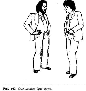 На рисунке 102 показаны двое оценивающих друг друга мужчин,использующих характерные жесты — руки на бедрах и пальцы за пояс. Учитывая, чтоони оба несколько отвернулись друг от друга, и нижние половины их тел ненапряжены, можно предположить, что мужчины подсознательно оценивают друг друга,и что нападение маловероятно.