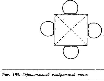 Как ранее отмечалось, квадратный стол способствует созданиюотношений соперничества и вызывающего поведения людей, равных по положению.Квадратные столы хороши для проведения короткой, деловой беседы или дляподчеркивания отношений субординации.
