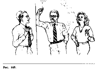 Рисунок 169. Эта женщина демонстрирует классические жестыженского кокетства. Одна нога у нее выставлена вперед, указывая на человекаслева (интерес), серия жестов — «руки на бедре» и «большой палец за поясом»говорит о сексуальной готовности, привлекательно выставлено левое запястье, иона при курении выпускает дым вверх (положительный настрой, уверенность всебе). Она также искоса поглядывает на человека слева, а он отвечает на еекокетливые жесты своими жестами: он поправляет галстук (прихорашивание), иносок его ноги направлен на женщину. Голова его поднята вверх(заинтересованность). Видно, что мужчина в центре группы не в восторге отприсутствия другого, т.к. он отвернулся от него и смотрит на него вызывающимвзглядом искоса. Его ладони не видны, и он направляет дым при курении вниз(отрицательное отношение), кроме того, он опирается о стену (территориальныйвызов).