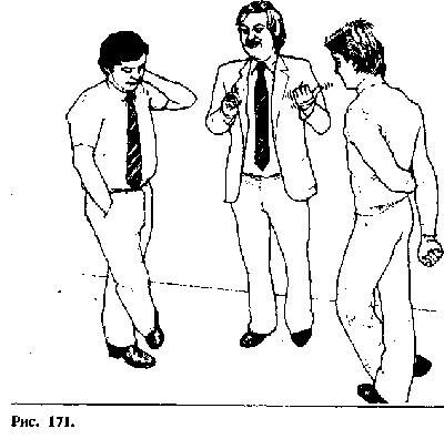 Рисунок 171. Человек справа и человек слева образовализакрытую диспозицию, чтобы показать человеку в центре, что o он не принят в ихкомпанию. Человек в середине относится к другим с чувством превосходства исарказмом, что видно из его жестов — одна рука держится за лацкан пиджака, апалец этой руки отставлен вверх (чувство превосходства), В дополнение к этомувысмеивающий жест в сторону человека, стоящего слева, заставил егоотреагировать оборонительной позой (скрещенные ноги), а также агрессивнымжестом — заложенные руки за спину при одной руке, захватывающей предплечьедругой (самообладание); характерен также и взгляд искоса. Человек слева такжене в восторге от поведения человека посередине. Он скрестил ноги (обороннаяпоза), рука в кармане (нежелание соучаствовать), взгляд в пол и потирание шеирукой.