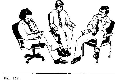 Рисунок 174. Человек слева демонстрирует превосходный букетжестов, передающих доверие, открытость и честность. Это протянутые ладони,выдвинутая вперед нога, поднятая голова, расстегнутый пиджак, расставленныеруки и ноги. Он наклоняется вперед и улыбается. К несчастью, его позиция ненаходит отклика у присутствующих. Женщина сидит глубоко откинувшись на спинкустула и перекинув ногу за ногу (оборонная позиция), она использует правую рукукак частичный барьер (оборонная поза). Ее стиснутые кулаки свидетельствуют овраждебном отношении. Голова наклонена вперед, и женщина прибегает еще к жестукритической оценки (рука под щекой). Мужчина в середине используетшпилеобразный жест, указывающий, что он чувствует себя уверенно и выше других.Сидит он, положив ногу на колено другой ноги, демонстрируя свое критическоеотношение. Общая поза — негативная, т.к. он сидит, откинувшись назад со склоненнойголовой.