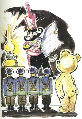 Колонна беглецов приблизилась к кровати. Я не стану вас уверять, что все сердца бились спокойно. Некоторые куклы еще не оправились от испуга и прятались за других, например за спину Желтого Медвежонка. Его маленький мозг из опилок соображал очень медленно. Происходящие события он воспринимал не сразу, а в порядке их очередности. Если нужно было одновременно понять две какие-нибудь вещи, у Желтого Медвежонка сразу же начиналась ужасная головная боль. Зато у него было хорошее зрение. Он первый увидел, что за неприятеля приняли маленького спящего мальчика. Медвежонка сразу охватило желание прыгнуть на кровать и поиграть с ним. Он даже не подумал о том, что спящие мальчики не играют с медвежатами, хотя бы и игрушечными.