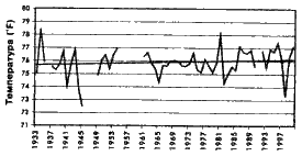 — Позвольте продемонстрировать вам несколько наборов данных с метеостанций. Вот, например, запись средних температур в Пасадине с 1930 года.[21]Как видите, — продолжила Дженифер, — здесь отмечается значительный рост среднегодовых температур. А вот данные по Беркли с 1930 года.